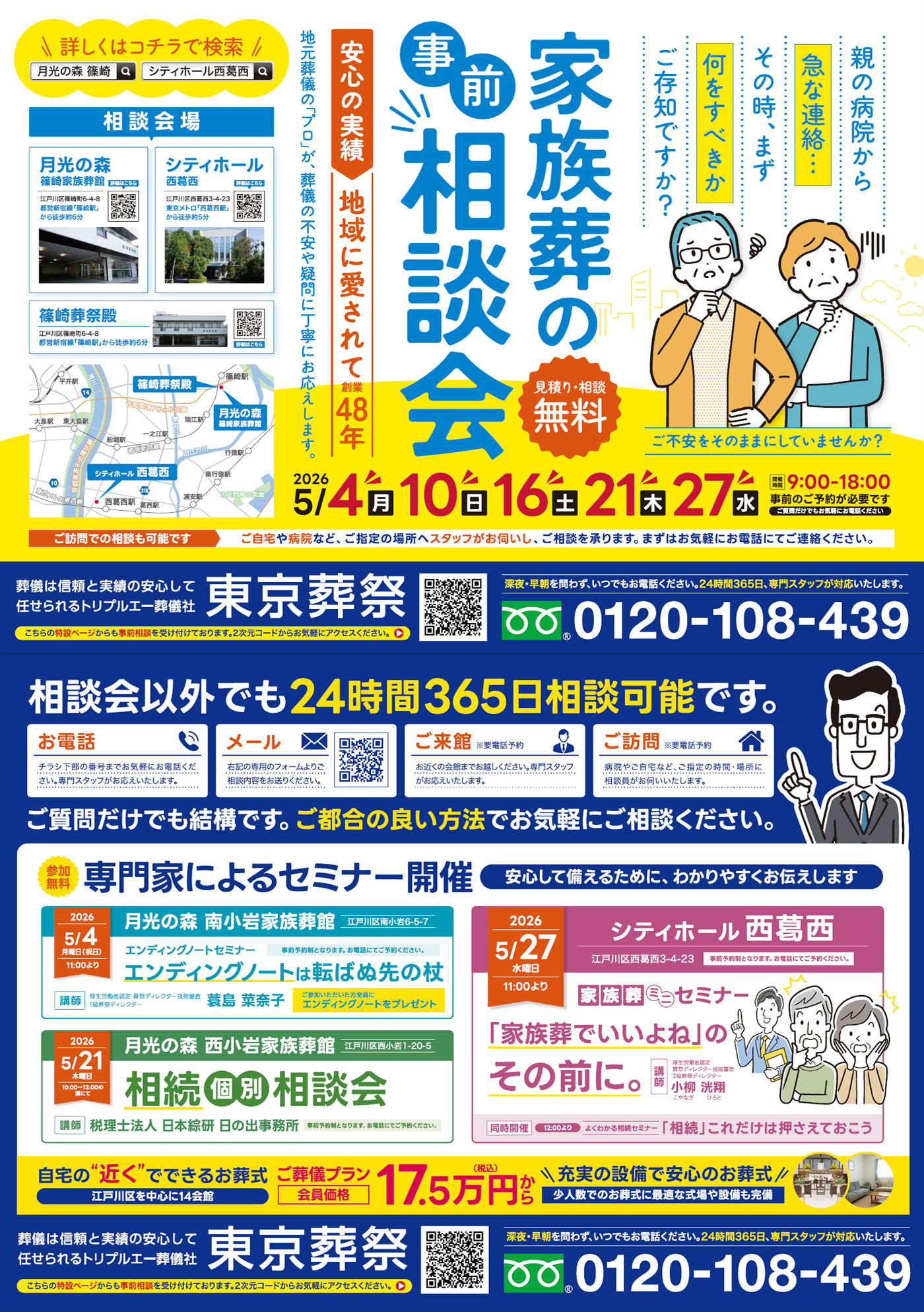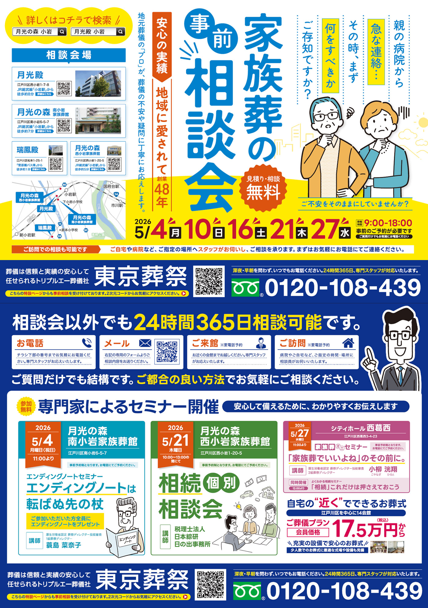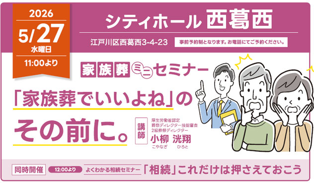 【江戸川区】5/4(月)10(日)16(土)21(木)27(水)家族葬無料相談会 開催のお知らせ