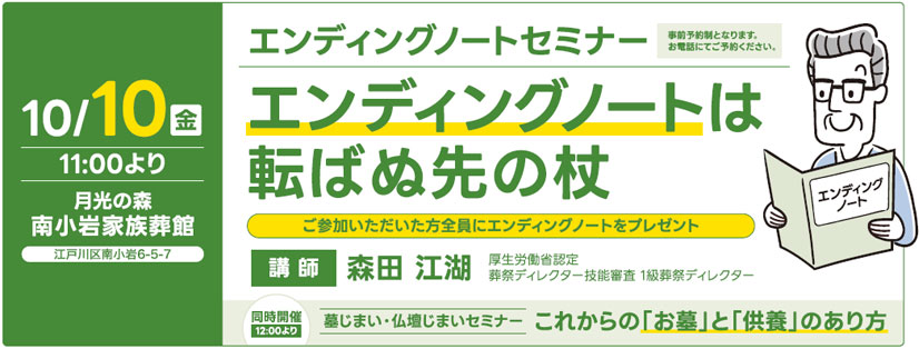 専門家によるエンディングノートセミナー「エンディングノートは転ばぬ先の杖」を行います。(11時から)